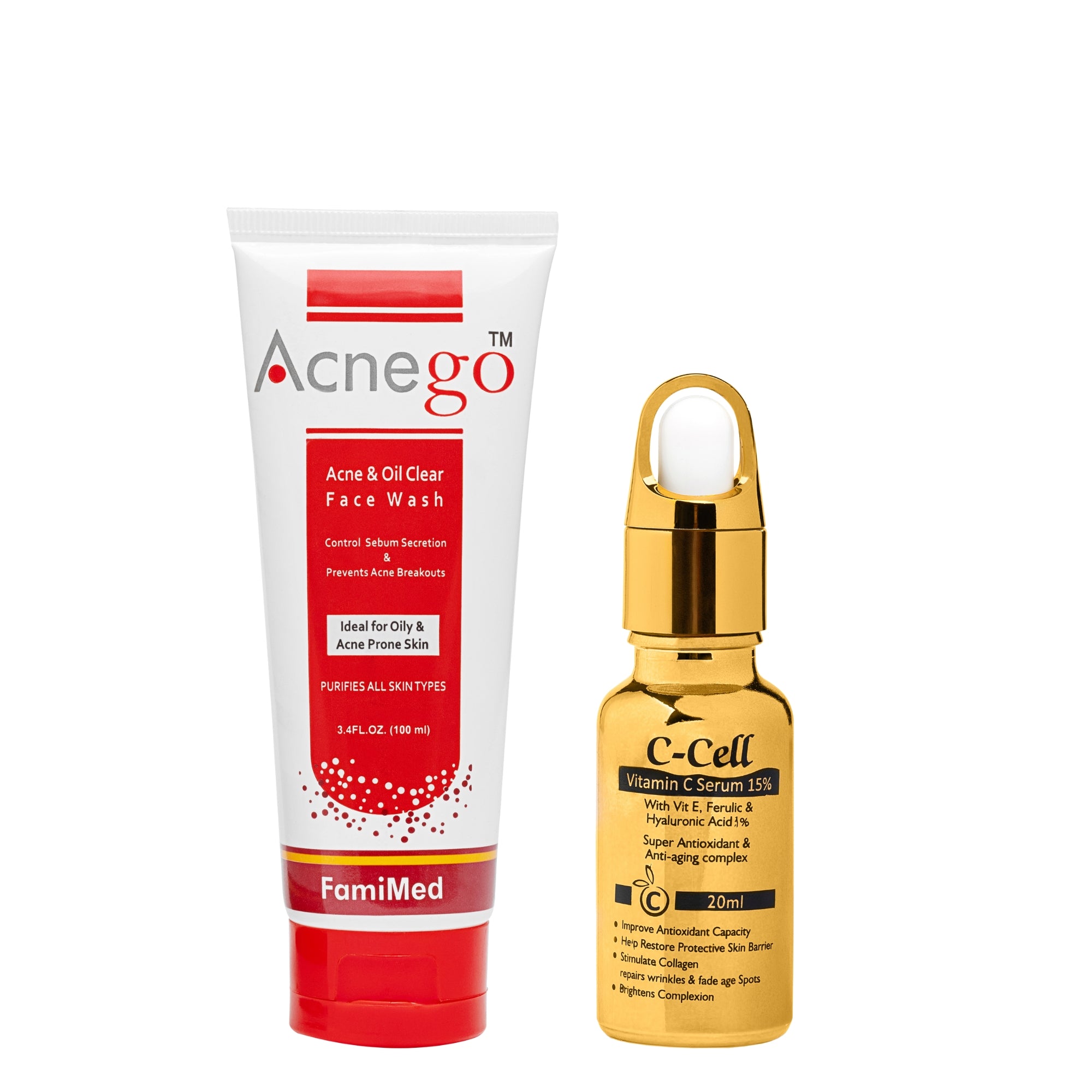 "Acne Care Essential Bundle" is a skin care bundle that includes a Vitamin C serum and an acne face wash. The acne face wash helps to clear up blemishes and prevent future breakouts, while the Vitamin C serum brightens and evens out skin tone, reducing the appearance of post-acne hyperpigmentation. Together, these products help to promote clear, healthy-looking skin with a radiant glow.