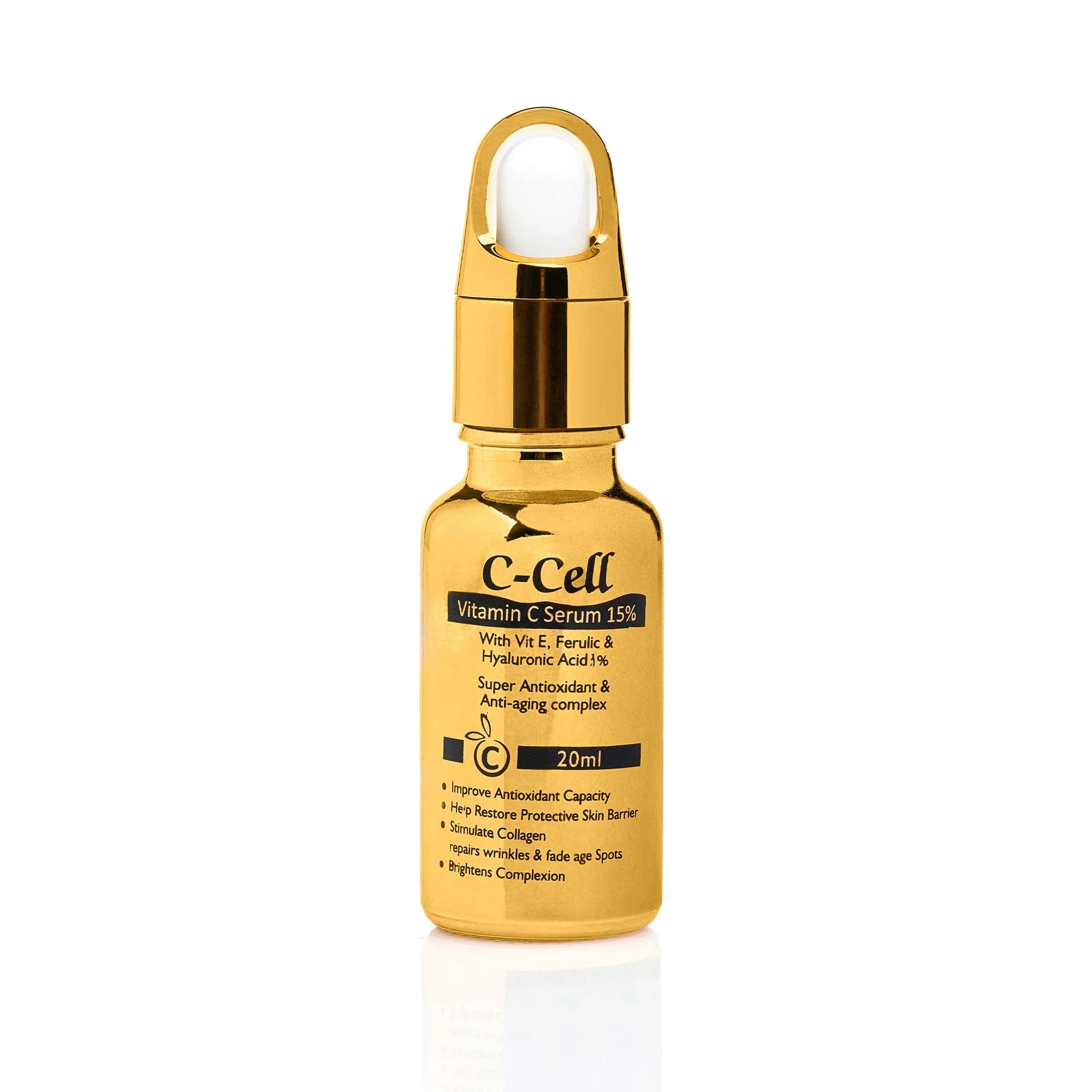 C-Cell Serum Vitamin C Serum is a Powerful blend of Antioxidants, that delivers advanced environmental Protection. Its Unique formulation heals dry and dehydrated skin cells with deep moisture, Revitalizes, smoothen and reduces the redness and inflammation after after laser and Skin Procedures. Stimulates Collagen repairs Wrinkles & Fade age Spots. Brightens Complexion Restores natural Radiance. Help Restore Protective Skin Barrier. Directions to use: Apply Several drops of serum to the fingertips of your index & middle fingers of one hand. Touch together and massage gently into the desired area using small circular motions until it has been completely absorbed. Use it Twice a day for the Best Result.